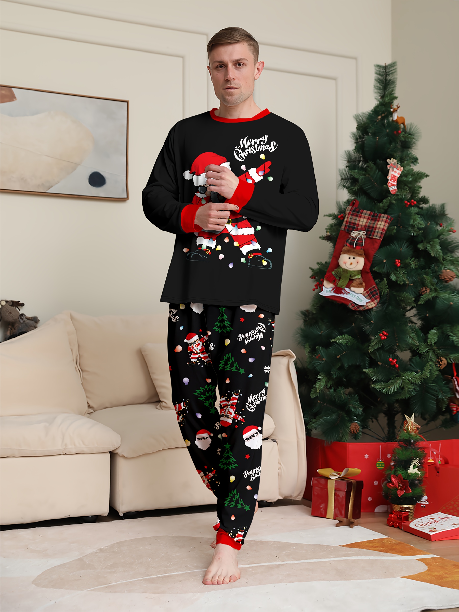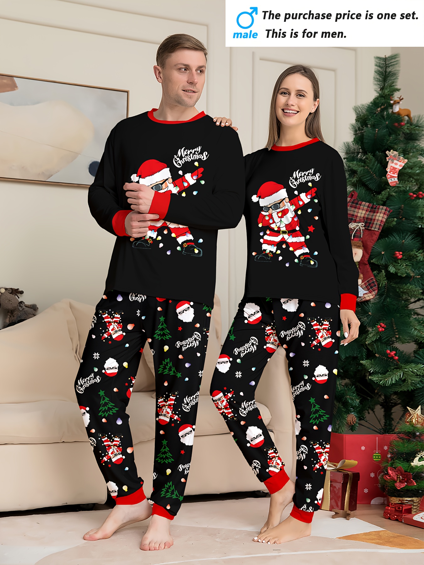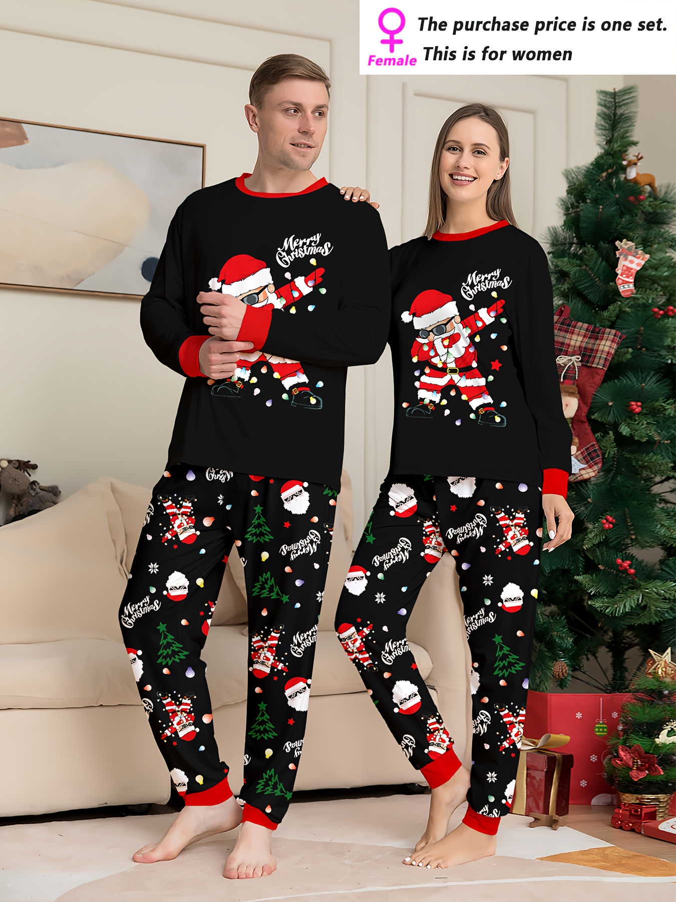MEN/WOMEN Couple's Christmas Long Sleeve Pajama Set with Santa, Christmas Tree, and Lights Print, Round Neck Design, Unisex